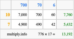 Below is an illustration showing you how to calculate 776 times 17 using the box method, using the instructions above.