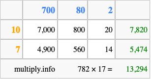 Below is an illustration showing you how to calculate 782 times 17 using the box method, using the instructions above.
