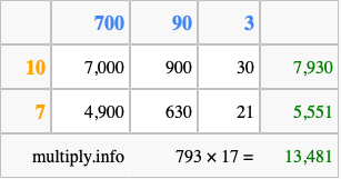 Below is an illustration showing you how to calculate 793 times 17 using the box method, using the instructions above.