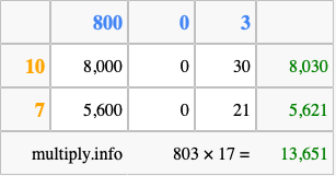 Below is an illustration showing you how to calculate 803 times 17 using the box method, using the instructions above.