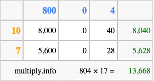 Below is an illustration showing you how to calculate 804 times 17 using the box method, using the instructions above.