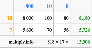 Below is an illustration showing you how to calculate 818 times 17 using the box method, using the instructions above.