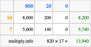 Finally, we add up all the sums we found in step 3 to get our final answer to 820 times 17.