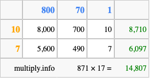 Below is an illustration showing you how to calculate 871 times 17 using the box method, using the instructions above.