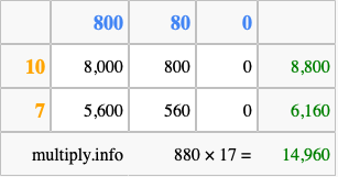 That's all there is to it! As you can see from the box above, the answer to 880 times 17 using the box method is 14,960.