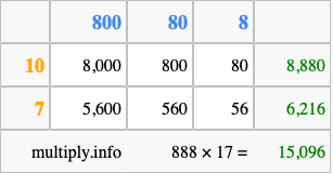 Finally, we add up all the sums we found in step 3 to get our final answer to 888 times 17.