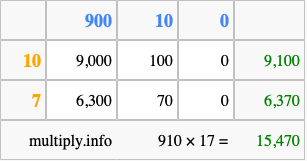 Below is an illustration showing you how to calculate 910 times 17 using the box method, using the instructions above.
