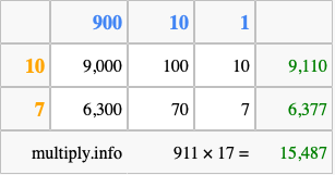 Finally, we add up all the sums we found in step 3 to get our final answer to 911 times 17.
