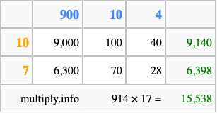 That's all there is to it! As you can see from the box above, the answer to 914 times 17 using the box method is 15,538.