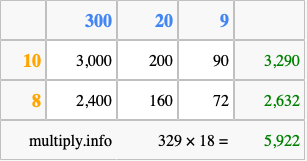 Below is an illustration showing you how to calculate 329 times 18 using the box method, using the instructions above.