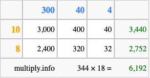 Below is an illustration showing you how to calculate 344 times 18 using the box method, using the instructions above.