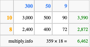 Finally, we add up all the sums we found in step 3 to get our final answer to 359 times 18.
