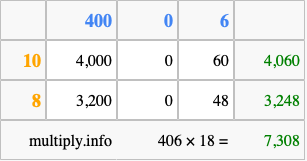 Below is an illustration showing you how to calculate 406 times 18 using the box method, using the instructions above.