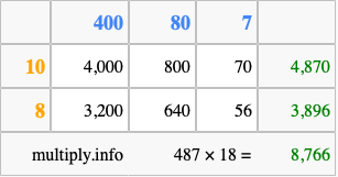 Finally, we add up all the sums we found in step 3 to get our final answer to 487 times 18.