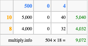 Below is an illustration showing you how to calculate 504 times 18 using the box method, using the instructions above.