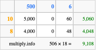 Below is an illustration showing you how to calculate 506 times 18 using the box method, using the instructions above.