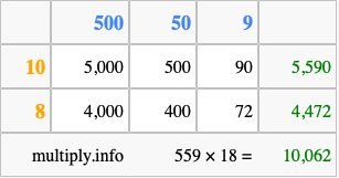 Below is an illustration showing you how to calculate 559 times 18 using the box method, using the instructions above.