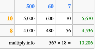 Finally, we add up all the sums we found in step 3 to get our final answer to 567 times 18.