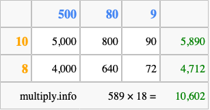 Below is an illustration showing you how to calculate 589 times 18 using the box method, using the instructions above.