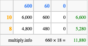 That's all there is to it! As you can see from the box above, the answer to 660 times 18 using the box method is 11,880.