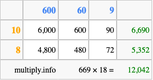 That's all there is to it! As you can see from the box above, the answer to 669 times 18 using the box method is 12,042.