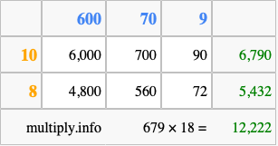 That's all there is to it! As you can see from the box above, the answer to 679 times 18 using the box method is 12,222.