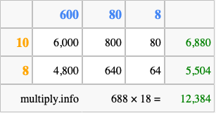 Finally, we add up all the sums we found in step 3 to get our final answer to 688 times 18.