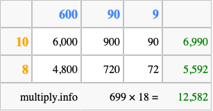 Below is an illustration showing you how to calculate 699 times 18 using the box method, using the instructions above.