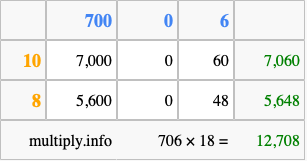 Finally, we add up all the sums we found in step 3 to get our final answer to 706 times 18.