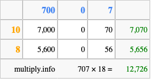 That's all there is to it! As you can see from the box above, the answer to 707 times 18 using the box method is 12,726.
