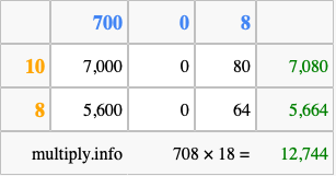 That's all there is to it! As you can see from the box above, the answer to 708 times 18 using the box method is 12,744.
