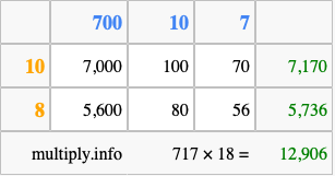 Finally, we add up all the sums we found in step 3 to get our final answer to 717 times 18.