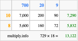 That's all there is to it! As you can see from the box above, the answer to 729 times 18 using the box method is 13,122.