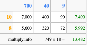 That's all there is to it! As you can see from the box above, the answer to 749 times 18 using the box method is 13,482.