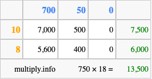 Finally, we add up all the sums we found in step 3 to get our final answer to 750 times 18.