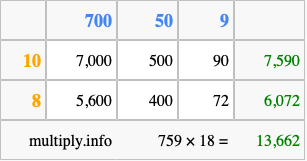 Below is an illustration showing you how to calculate 759 times 18 using the box method, using the instructions above.