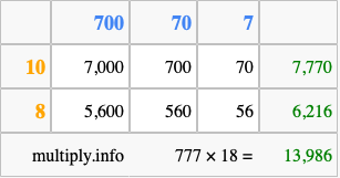 That's all there is to it! As you can see from the box above, the answer to 777 times 18 using the box method is 13,986.
