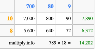 Below is an illustration showing you how to calculate 789 times 18 using the box method, using the instructions above.