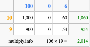 Below is an illustration showing you how to calculate 106 times 19 using the box method, using the instructions above.