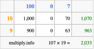 Below is an illustration showing you how to calculate 107 times 19 using the box method, using the instructions above.