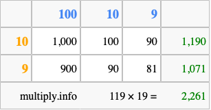 That's all there is to it! As you can see from the box above, the answer to 119 times 19 using the box method is 2,261.