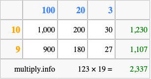 That's all there is to it! As you can see from the box above, the answer to 123 times 19 using the box method is 2,337.