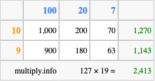 Below is an illustration showing you how to calculate 127 times 19 using the box method, using the instructions above.