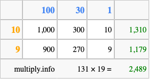 Below is an illustration showing you how to calculate 131 times 19 using the box method, using the instructions above.