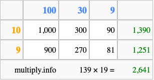 Finally, we add up all the sums we found in step 3 to get our final answer to 139 times 19.