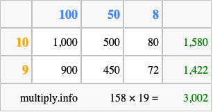 Below is an illustration showing you how to calculate 158 times 19 using the box method, using the instructions above.