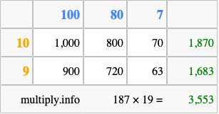 That's all there is to it! As you can see from the box above, the answer to 187 times 19 using the box method is 3,553.