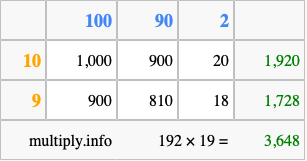 Below is an illustration showing you how to calculate 192 times 19 using the box method, using the instructions above.