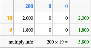 Below is an illustration showing you how to calculate 200 times 19 using the box method, using the instructions above.