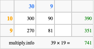 That's all there is to it! As you can see from the box above, the answer to 39 times 19 using the box method is 741.